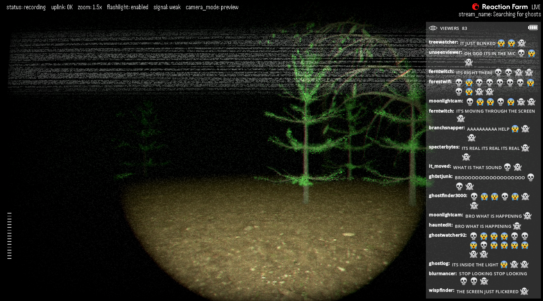 Navigate a haunted forest with chat as your eyes. You don't see anything, but chat does. They see something, in the distance. Are you sure you want to know?
